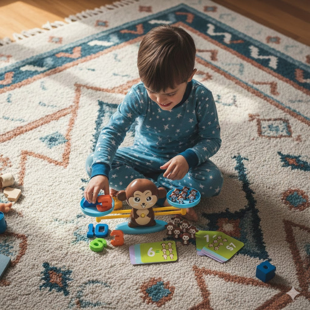 Adım Adım Öğrenme: Kartlar basitten zora ilerler; çocuk sayıları, toplamayı ve denge ilişkisini aşamalı olarak öğrenir.